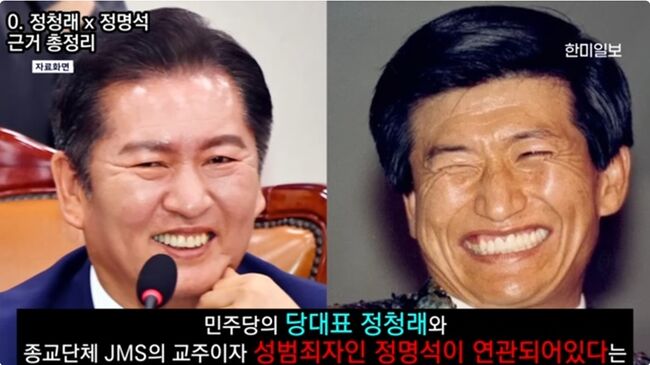 이 와중에 소환된 정청래와 정명석, 두 인물의 유착 주장은 비단 처음 제기된 것만은 아니다. 일찌감치 공통된 출신지와 본관 등으로 인해 ‘혈연관계’가 아니겠냐는 주장 글들이 커뮤니티와 포탈에서 심심찮게 발견되며 의혹의 불씨를 남기고 있었다. 특히 이들의 정치적 행보와 종교적 배경이 미묘하게 얽히면서 다층적인 의구심을 낳아 온 셈이다.