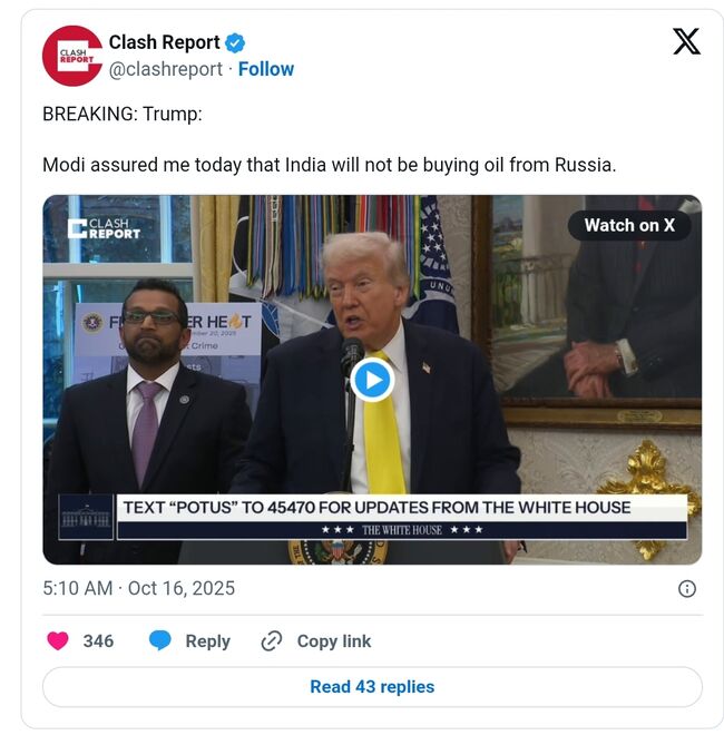 도널드 트럼프 대통령은 15일(수) 인도의 나렌드라 모디 총리가 자신에게 인도가 더 이상 러시아산 석유를 구매하지 않을 것이라고 직접 말했다고 밝혔다.