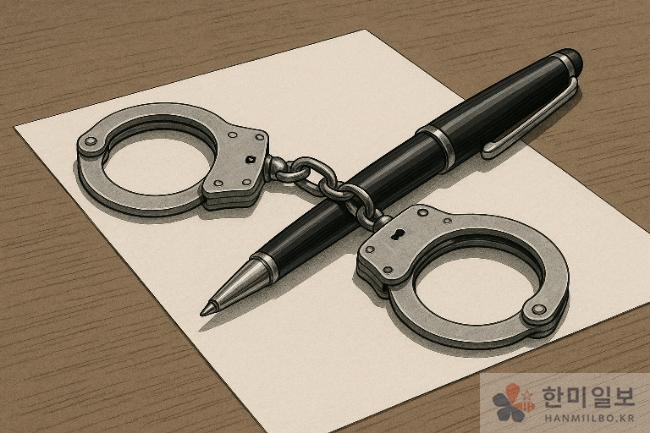 법의 수갑에 묶인 펜, 정당의 고발 앞에서 위축되는 언론의 자유를 상징한다. 한미일보 그래픽