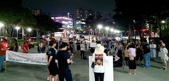 지난 여름 경기도 용인 수지에서 선관위 조처에 항의하는 집회가 열리고 있다. / 사진 제공=‘부정선거 신의작품인가’ 영화제작사 루이다코프 홍미란 대표.