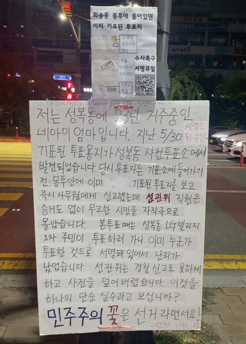 앞서 6.3대선의 사전투표가 치러진 지난 5월30일 용인 수지 성복동 주민센터에서 여성 유권자가 선관위로부터 받은 회송용 봉투 안에 이재명으로 기표가 된 투표용지가 접힌 채 들어 있어 경찰이 출동하는 소동이 빚어졌다. 그러나 선관위가 자작극으로 몰아가자 이에 반발하는 거센 시위 물결이 전국 규모로 확산한 바 있다.