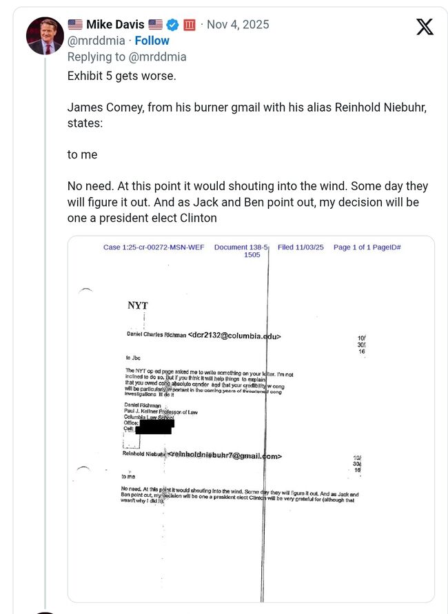 법무부가 공개한 증거 중 2016년 10월 30일자 이메일에서 코미는 "나에게. 필요 없어요. 지금쯤이면 바람에 대고 소리 지르는 게 나을 거예요. 언젠가는 알아낼 거예요. 잭과 벤이 지적했듯이, 제 결정은 클린턴 대통령 당선인이 매우 고마워할 결정이 될 거예요 (물론 제가 그런 결정을 내린 이유는 아니지만요)."라고 썼다.