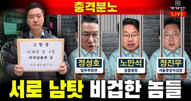 가로세로연구소(가세연)는 지난 8일 이재명과 법무장관 정성호 씨, 검찰총장 대행 노만석 씨, 전 서울중앙지검장 정진우 씨 등 4명을 직권남용 혐의 등으로 경찰에 고발했다고 밝혔다.
