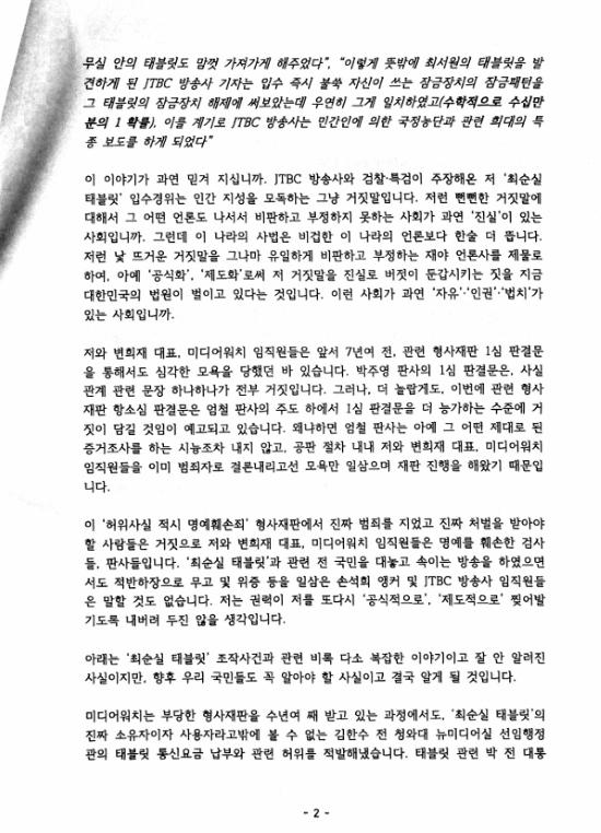 미디어워치는 공식 유서를 공개하며 “엄철, 윤원묵, 송중호 등 서울중앙지법 항소 4-2 부 재판부는, JTBC가 보도한 태블릿의 신규계약서 위조부터, 한동훈 등이 조작한 제2 태블릿 관련 증거들을 모조리 기각하며, 오직 태블릿 조작범죄 은폐를 목적으로, 일방적 재판을 진행해왔다. 이에 황의원 전 대표, 변희재 대표 등이 조희대 대법원에까지 항의했으나, 단 하나의 시정조치도 없이, 재판이 진행되며 이달 24일 선고기일이 진행될 예정이었다”고 전했다.