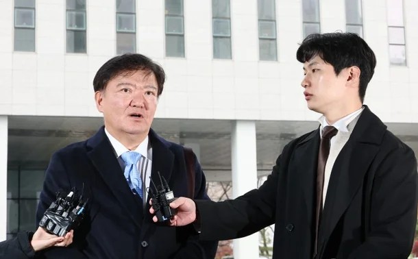민경욱 전 국회의원이 20일 서울 양천구 서울남부지방법원에서 열린 '국회 패스트트랙 충돌' 1심 선고 공판을 마치고 취재진 질문에 답하고 있다. 연합뉴스