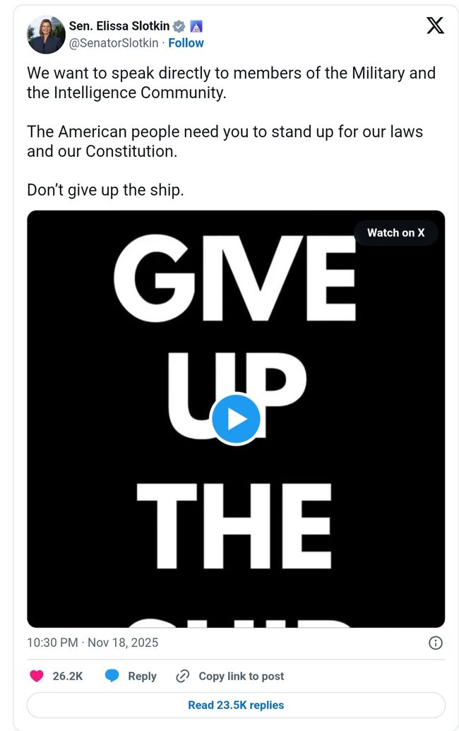 그녀는 "미국 의회의 현직 의원들이 공모하여 미군 장병들, 현역 군인들, 국가 안보 기관 구성원들에게 대통령의 합법적인 명령을 무시하도록 독려하는 영상 메시지를 기획했다"고 지적했다.