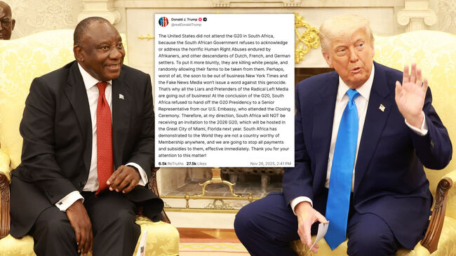트럼프는 "남아공은 세계에 그들이 어느 곳에서도 회원 자격이 없는 국가임을 증명했으며, 우리는 즉시 그들에 대한 모든 지급과 보조금을 중단할 것이다. 이 문제에 대한 관심에 감사하다!"라고 덧붙였다.