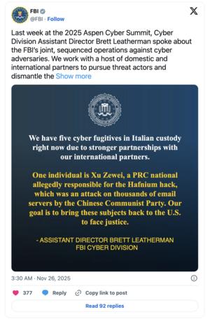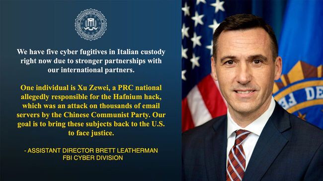 FBI는 게시물에서 “현재 이탈리아 당국이 우리 국제 파트너들과의 강화된 협력 관계 덕분에 5명의 사이버 범죄자를 구금하고 있다”며 “그중 한 명은 중국 공산당(중공·CCP)이 수천 개의 이메일 서버를 공격한 ‘하프늄 해킹(Hafnium Hack)’ 사건의 주범으로 지목된 중국 국적자 쉬저웨이(Xu Zewei)가 포함됐다”고 폭로했다.