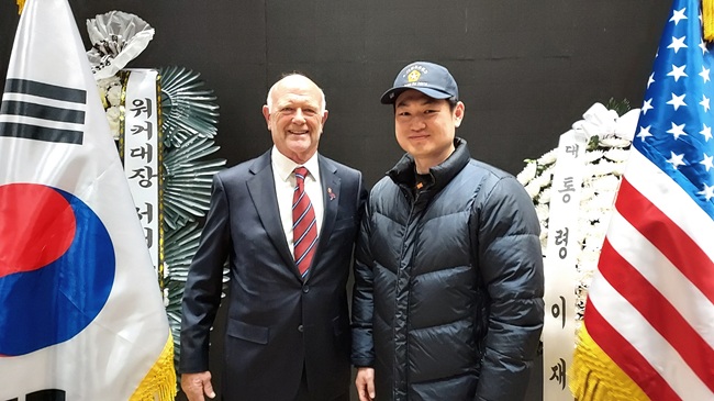 6·25 전쟁영웅 월튼 워커 장군의 손자 샘 워커(왼쪽)와 권순도 감독. Ⓒ한미일보