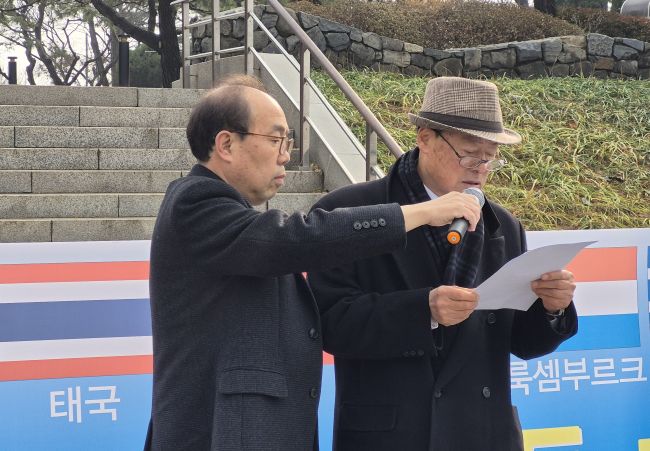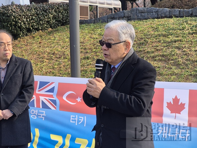 위에서부터 사회를 맡은 조형곤(왼쪽) 장진호전투기념사업회 집행위원장, 김석우 전 통일부 차관, 이석복 대한민국지키기불교도총연합 대표, 고영주 자유민주당 대표, 이재춘 장진호전투기념사업회 상임대표, 장경덕 장진호전투기념사업회 공동대표, 이동복 전 국회의원. Ⓒ한미일보