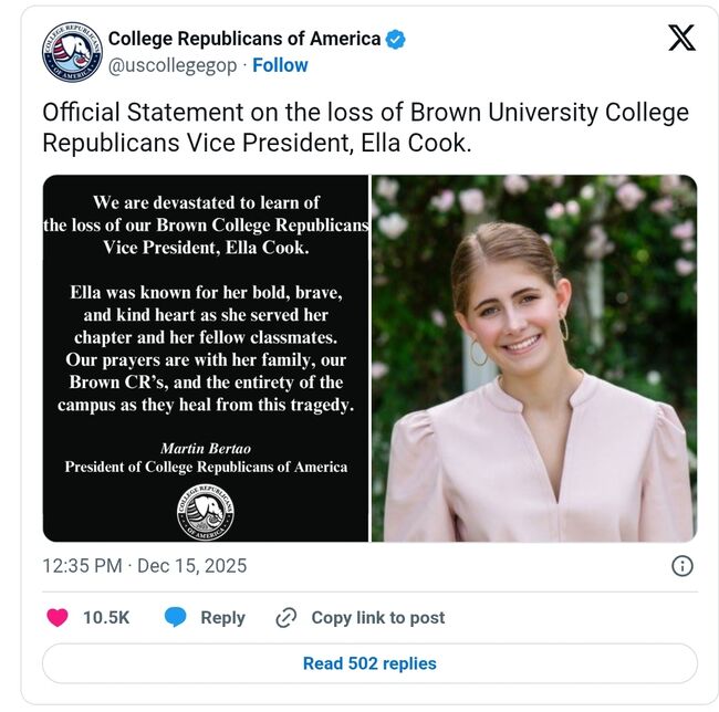 미국 대학 공화당원 협회는 일요일 엑스(X) 게시글에서 "브라운 대학 공화당 부회장 엘라 쿡의 사망 소식에 깊은 슬픔을 느낀다"며 "엘라는 학회와 동료들을 위해 봉사하며 대담하고 용감하며 친절한 마음씨로 잘 알려져 있었다"고 밝혔다.