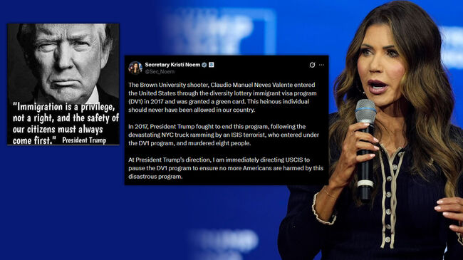 크리스티 노엠 국토안보부 장관은 18일 오후 늦게 엑스(X)에 게시한 글에서 "브라운 대학교 총격범 클라우디오 마누엘 네베스 발렌테(Claudio Manuel Neves Valente)는 2017년 다양성 추첨 이민 비자 프로그램(DV1:diversity lottery immigrant visa program)을 통해 미국에 입국해 영주권을 취득했다. 이 흉악한 인물은 결코 우리 나라에 들어오지 못했어야 했다"고 밝혔다.