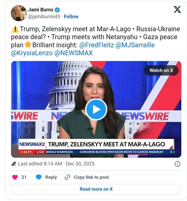 트럼프 첫 임기 국가안보회의(NSC) 비서실장을 지낸 플라이츠는 "이 트윗은 절박한 심정으로 보낸 것 같다"면서 "어제 우크라이나에 정말 좋은 소식이 있었다. 트럼프와 젤렌스키 사이의 관계는 그 어느 때보다 강했다."라고 말했다.
