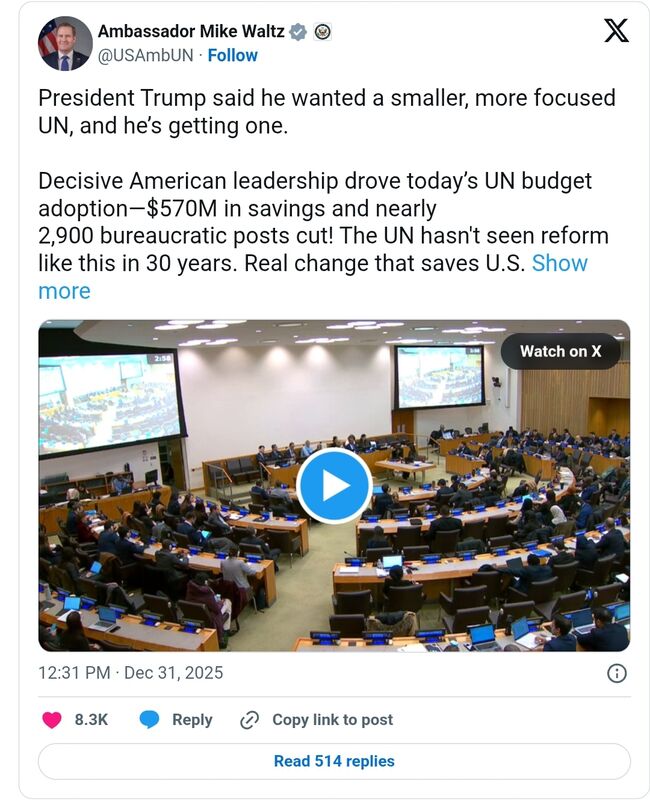 마이크 월츠(Mike Waltz,공화) 유엔대사는 이날 밤 엑스(X)에 "트럼프 대통령은 더 작고 집중도가 높은 유엔을 원한다고 말했고, 그는 그런 유엔을 얻게 되고 있다"면서 "미국의 단호한 리더십 덕분에 오늘 유엔 에산안이 채택됐다"고 전했다.