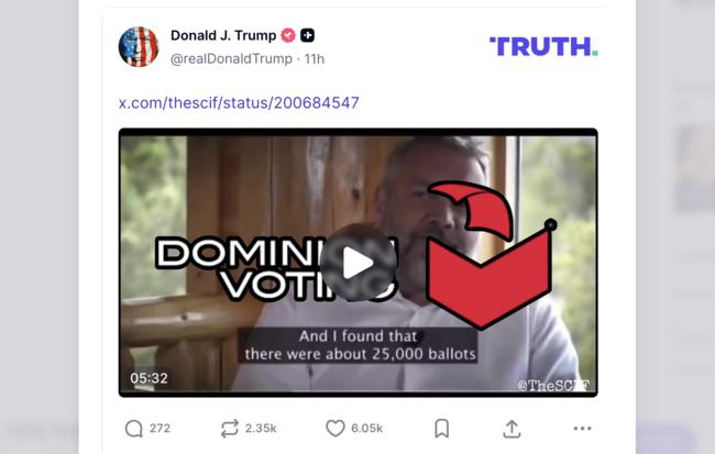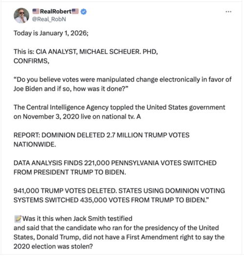 리얼로버트(@Real_RobN)의 게시물도 다시 포스트했다. 이 게시물은 “도미니언은 2020년 대선에서 전국적으로 트럼프 후보를 찍은 270만 표를 삭제했다”며 “전직 미 중앙정보국(CIA) 데이터 분석가 마이클 쇼이어(Michael Scheuer)는 펜실베이니아에서만 22만1000표를 트럼프 후보에게서 바이든에게로 옮긴 것을 찾아냈다”고 폭로하는 콘텐츠다.