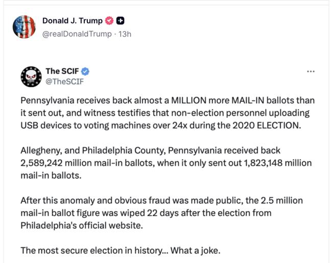 이 게시물은 우편투표의 문제점을 집중 진단했다. SCIF는 게시물에서 “펜실베이니아는 2020년 대선 당시 발송한 우편 투표용지보다 100만 장에 가까운 투표지가 회수됐다”며 “선거사무 종사자가 아닌 이들(non-election personnel)이 USB 장치로 24시간 이상 투표기기에 업로드했다는 목격자의 선서진술이 있다”고 했다. 즉 도미니언의 전산 조작으로 집계 결과를 바꾼 만큼 오프라인에서 부역자들이 투표지를 맞추기 위해 암약했다는 얘기다.
