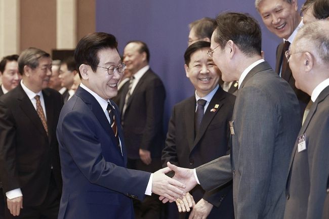 이재명 대통령이 5일 베이징 조어대에서 열린 한·중 비즈니스 포럼에서 이재용 삼성전자 회장과 인사하고 있다. [사진=연합뉴스]