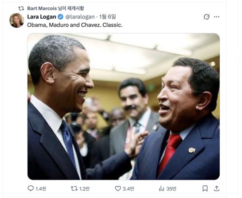 오바마(왼쪽)와 차베스(오른쪽), 마두로(가운데). [라라 로건 X 계정 캡처]