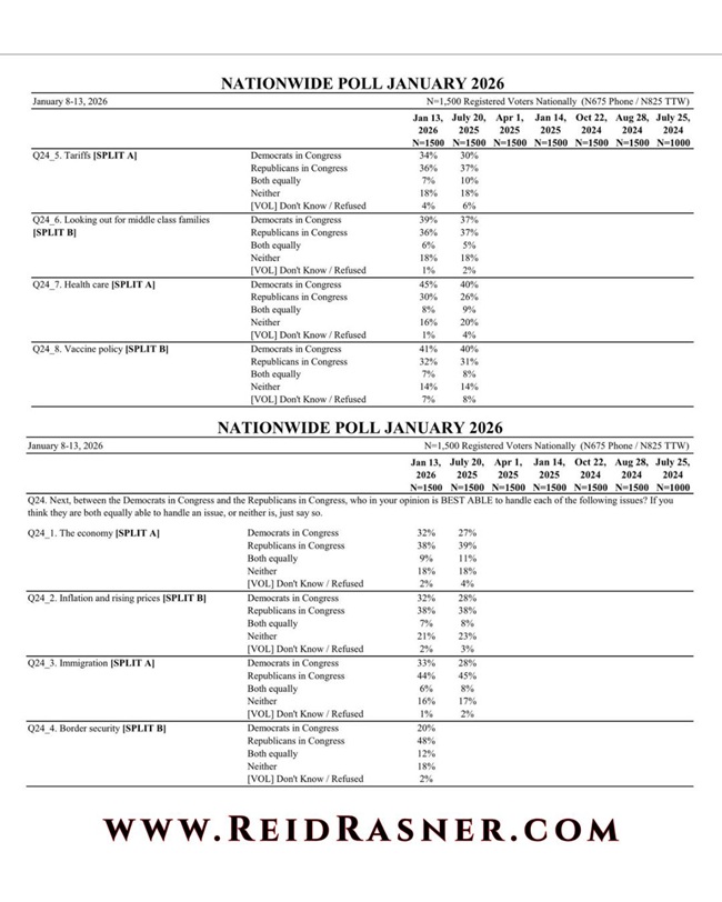 미국 정치 컨설턴트이자 여론조사 기관인 리드 라스너(Reid Rasner)는 “민주당은 충격적인 새 여론조사 결과에 공황 상태에 빠졌다”며 “경제 및 인플레이션 문제에 있어 공화당의 신뢰도가 민주당에 비해 6%p, 관세 문제에 있어 2%p, 이민 문제에 있어 11%p, 국경 안보 문제에 있어 28%p 더 신뢰하는 것으로 나타났다”고 19일 소셜미디어를 통해 발표했다.