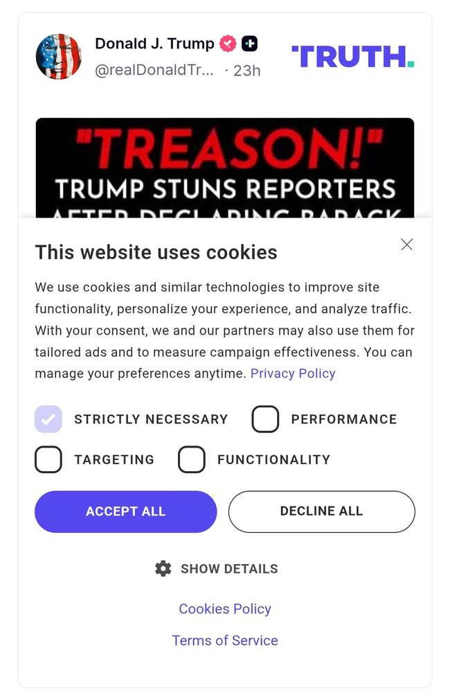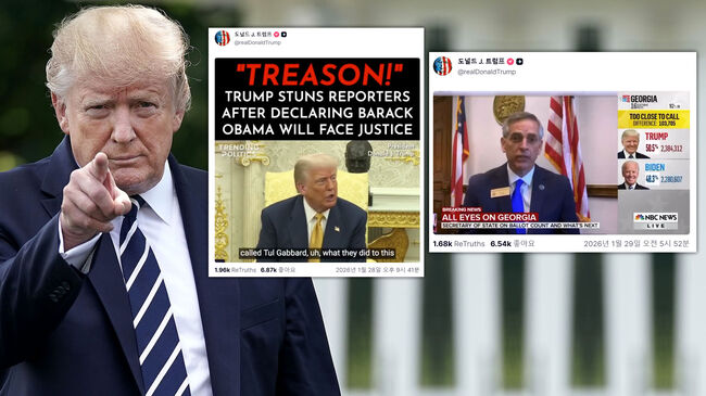 트럼프 대통령은 28일(수) 트루스소셜에 지난 7월 22일 필리핀 대통령과 가진 양자회담 자리에서 기자들의 질문에 답변한 영상을 게재하면서 "반역이다! 트럼프, 버락 오바마가 법의 심판을 받게 될 것이라고 선언한 뒤 기자들을 경악케 하다"라는 제목을 달았다.