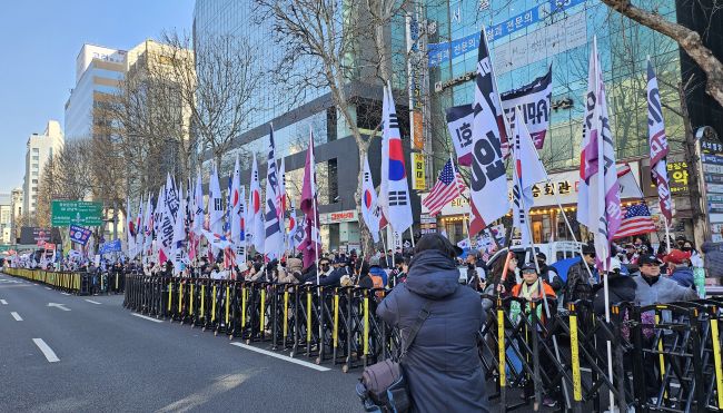 서울 서초구 서울중앙지법 앞에서 애국보수 시민들이 ‘윤석열 무죄’를 외치고 있다. [사진=화랑단]
