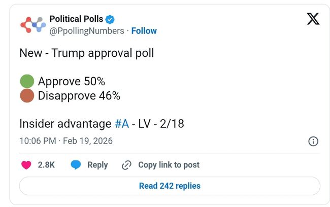 이 여론조사기관은 "2월 17일부터 18일까지 유권자 800명을 대상으로 실시한 전국 여론조사에서 오차범위 ±3.46%를 감안할 때 도널드 트럼프의 지지율은 2024년 11월 대선 전국 득표율과 거의 비슷하거나 약간 높은 것으로 나타났다"고 밝혔다.