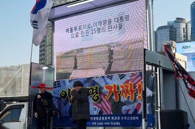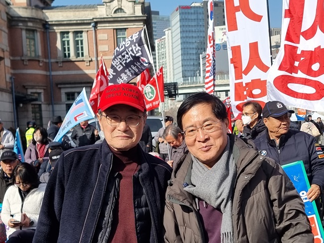 서버까국민운동본부 주최로 21일 3시에 열린 부정선거 규탄 집회에서는 ‘벽돌 투표지’ 묵인 의혹을 받고 있는 선관위원장 15인을 美 CIA에 신고할 예정이라는 핵폭탄급 선언이 있었다. 세 번째 사진 장재언(왼쪽)박사와 이상로 정치평론가. [사진=임요희 기자]