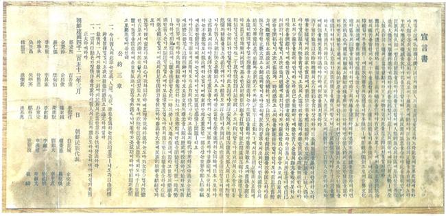 선언서는 육당 최남선이 작성하고, 공약(公約) 3장은 행동강령으로 만해 한용운이 추기(追記)했으며, 서명 일자를 공란으로 둔 것은 거사일을 미리 알릴 수 없기 때문이었다.
