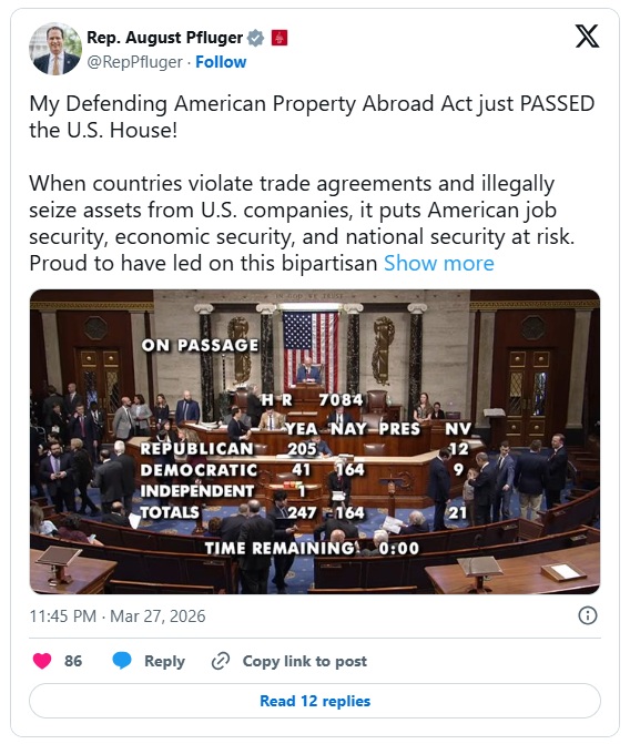 텍사스주 공화당 소속 어거스트 플루거 하원의원이 발의한 '해외 미국 재산 보호법(Defending American Property Abroad Act of 2026)'은 27일(금) 오전 표결에 부쳐져 찬성 247표, 반대 164표로 통과됐다.