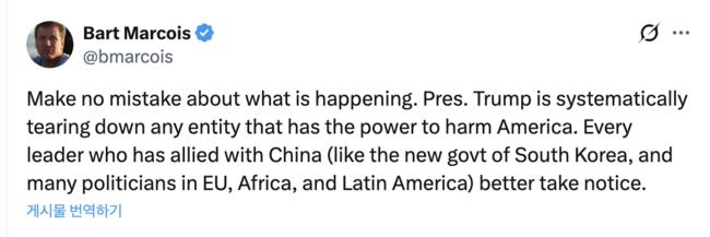 특히 “중국과 동맹을 맺은 모든 지도자(한국의 새 정부와 EU·아프리카·라틴 아메리카의 많은 정치인)는 주목하는 게 좋다(Every leader who has allied with China (like the new govt of South Korea, and many politicians in EU, Africa, and Latin America) better take notice)”며 이재명 정부를 직접 겨냥했다.