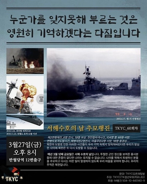 제2연평해전, 천안함 피격, 연평도 포격전 등 서해에서 국가를 위해 희생한 영웅들을 기리는 ‘서해수호의 날’ 추모 행사가 대구에서 열린다. 청년 시민단체 TKYC(TK청년우파커뮤니티)는 27일 금요일 저녁 8시, 대구 반월당역 12번 출구 앞에서 ‘서해수호의 날 추모행진’을 개최한다. 서해를 지킨 영웅들의 희생을 기리다 서해...