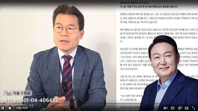 전한길 대표가 유튜브 채널 ‘전한길뉴스’에서 윤석열 대통령과 편지를 주고받은 것에 대해 밝히고 있다. 2025.11.29. [전한길뉴스 유튜브 채널 캡처]