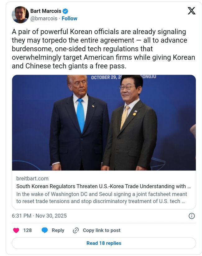 워싱턴DC와 서울이 무역 긴장 재설정 및 한국 내 미국 기술 기업에 대한 차별적 대우 중단을 위한 공동 팩트시트에 서명한 직후, 한국의 두 고위 관료가 이미 이 협정 전체를 무산시킬 수 있다는 신호를 보내고 있다고 브라이트바트뉴스가 28일(금) 보도했다.