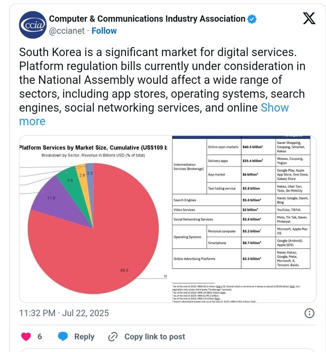 컴퓨터 및 통신 산업 협회(CCIA)에 따르면, 업계에서는 한국의 플랫폼 규제 법안이 미국 기업의 총 시장 수익에 1,090억 달러의 영향을 미칠 것으로 추산한다.