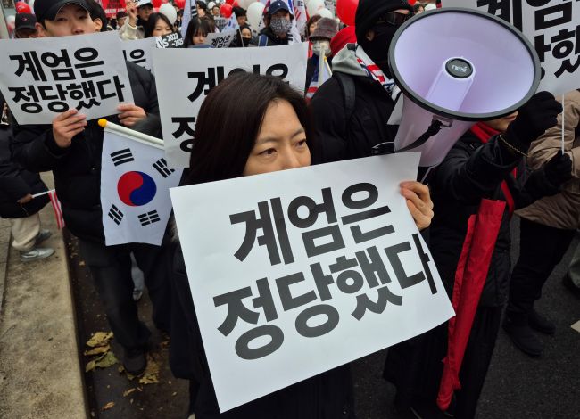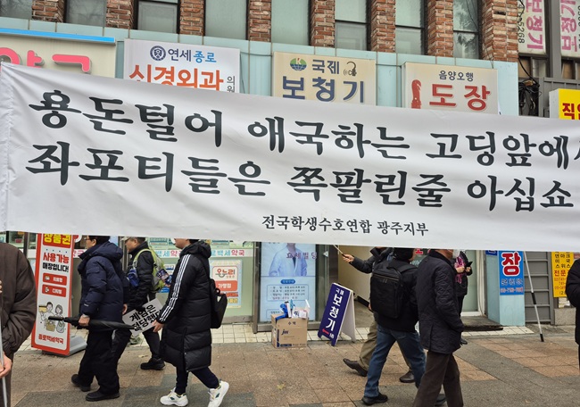 또 “용돈 털어 애국하는 고딩 앞에 좌포티들은 쪽팔린 줄 아십쇼” “비상계엄은 내란이 아니다” 등의 현수막도 눈에 띄었다.