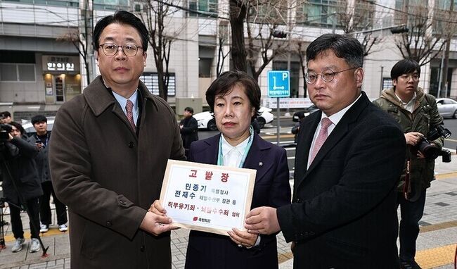 국민의힘 곽규택(왼쪽부터), 조배숙 의원, 김기윤 법률자문위 부위원장이 11일 종로구 서울경찰청에서 통일교 금품수수 의혹과 관련해 민중기 특별검사와 전재수 해양수산부 장관 및 민주당 전현직 의원들을 각각 직무유기, 정치자금법 위반·뇌물수수 혐의로 고발하기 위해 민원실로 향하고 있다. 연합뉴스