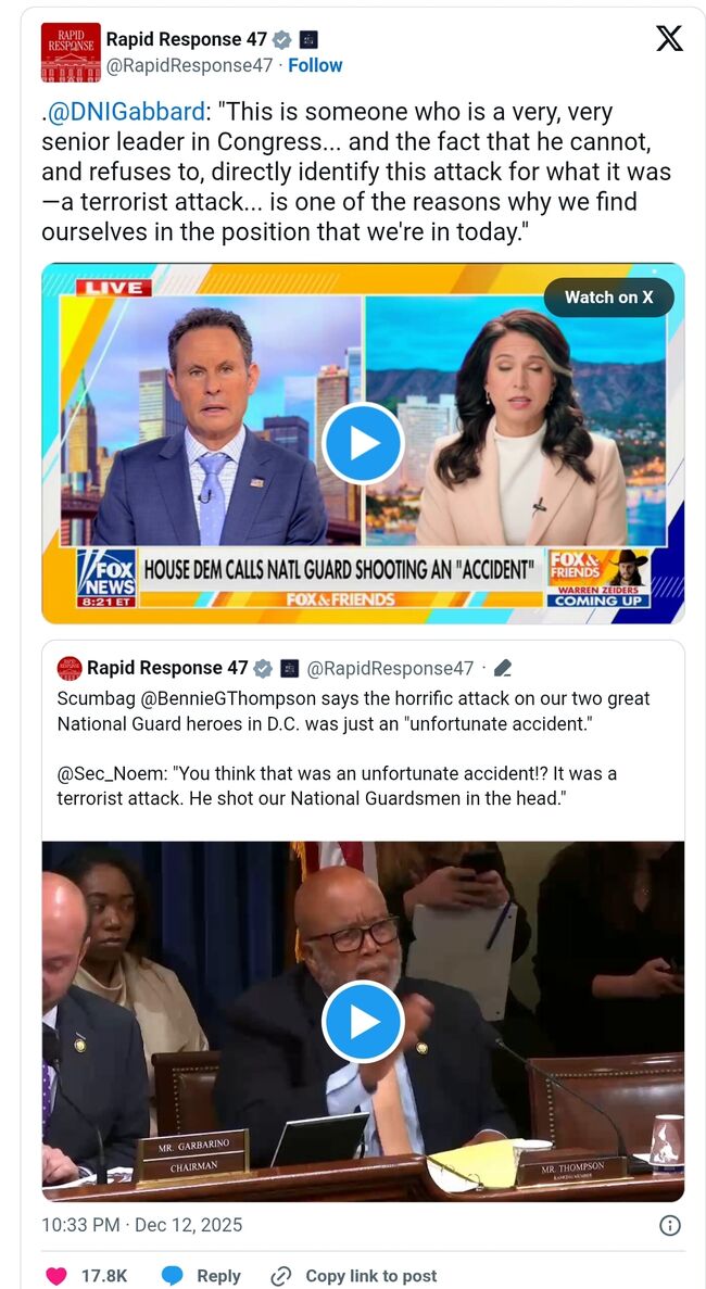 톰슨 의원은 목요일 크리스티 노엠 장관을 증인으로 세운 하원 국토안보위 청문회에서 "불행한 사고"라고 말했다가, 노엠 장관으로부터 "근무 중이던 군인들이 테러를 당한 것이 사고라고?"라며 반발하자, 증인이 질문을 해도 되는 것이냐며 당황스러워하다가 "불행한 상황"이라고 자신의 말을 수정했다.