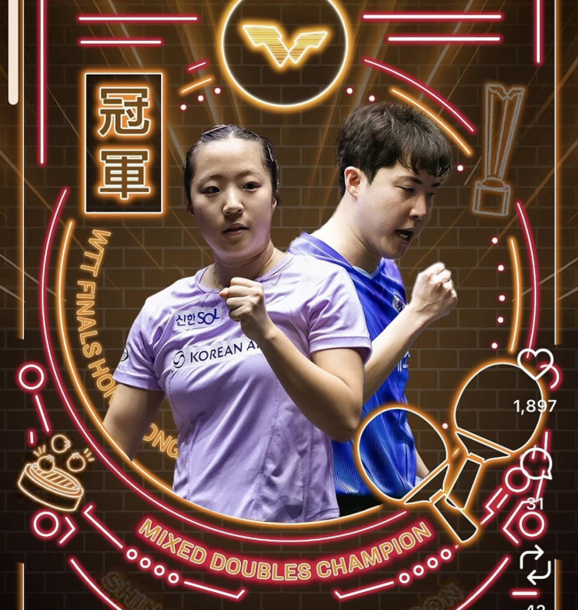 WTT 파이널스 홍콩 혼복 우승을 합작한 신유빈(왼쪽)과 임종훈. WTT 인스타그램 캡처 작년 파리 올림픽 탁구 혼합복식 동메달을 합작한 '황금 콤비' 신유빈(대한항공)과 임종훈(한국거래소)이 올해 월드테이블테니스(WTT) 시리즈를 총결산하는 왕중왕전에서 만리장성을 허물고 정상에 오르는 쾌거를 이뤘다.