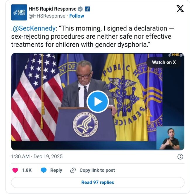 로버트 F. 케네디 주니어 보건복지부 장관은 "내 리더십 하에, 그리고 트럼프 대통령의 요청에 따라, 연방 정부는 우리 아이들을 위험에 빠뜨리는 안전하지 않고 돌이킬 수 없는 관행을 막기 위해 모든 노력을 다할 것"이라고 말했다.