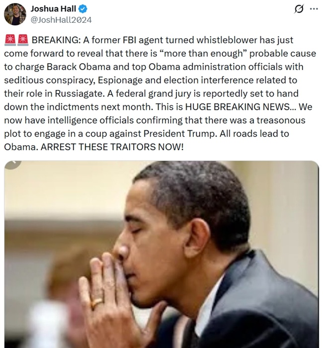 이어지는 다른 게시물에는 “내부고발자가 오바마 전 대통령과 오바마 행정부 고위 관리들이 러시아게이트 사건과 관련하여 반역 음모, 간첩 행위, 선거 개입 혐의로 기소될 만한 충분한 증거가 있다고 밝혔다”며 “연방 대배심(Grand Jury)은 다음 달에 기소장을 제출할 예정”이라고 전했다.