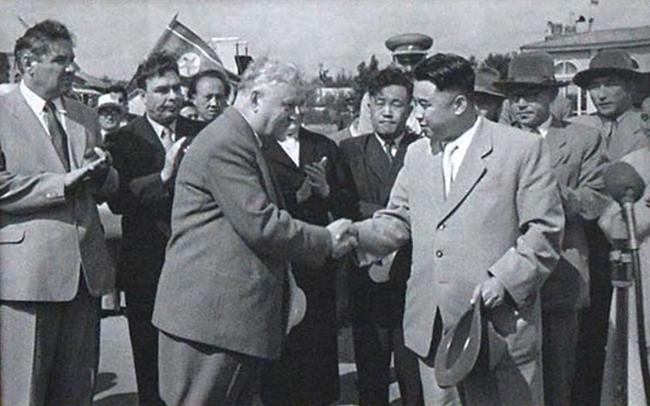 주석 자리에 오른 북한 김일성이 1956년 6월 소련을 공식 방문, 모스크바에서 소련 관계자들과 인사하고 있다. [평양 조선중앙통신=연합뉴스]
