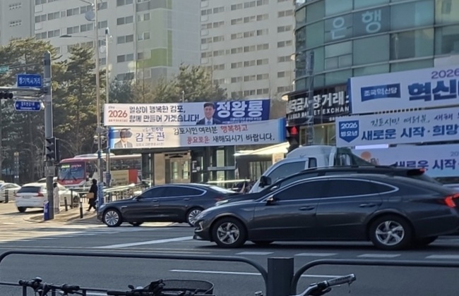 김포시 운양동은 대형 교차로와 주요 간선도로 등 대로변에만 최소 10개 이상의 현수막이 게시된 것으로 확인됐으며, 인접한 장기동에서도 대로변 구간에서 최소 6개 이상의 현수막이 연속적으로 설치된 모습이 관찰됐다.