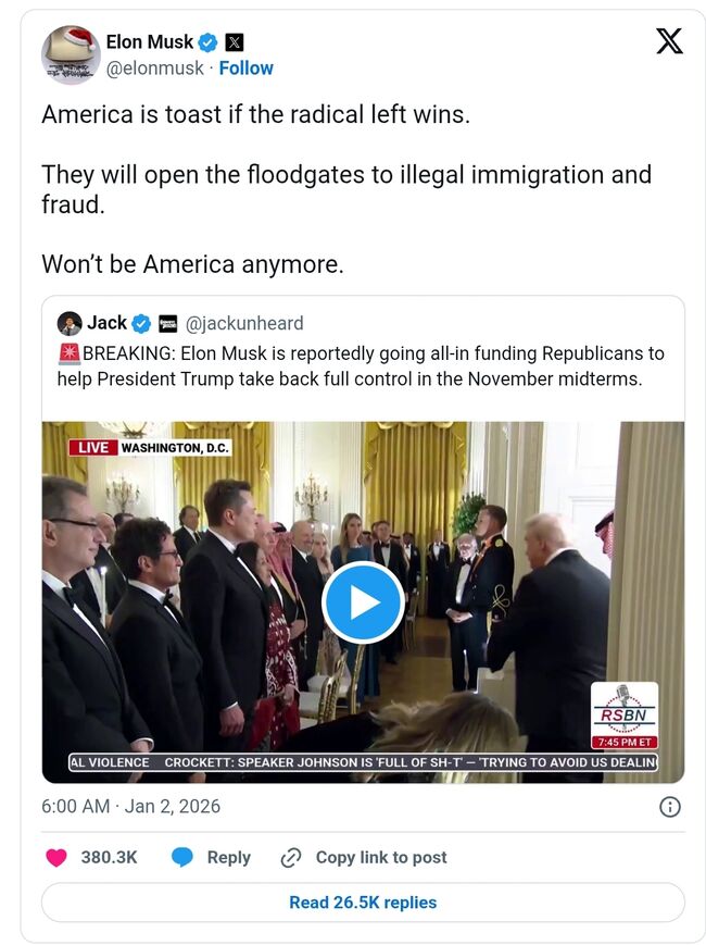 빅테크 거물이자 억만장자인 일론 머스크가 "미국의 파멸"을 막겠다면서 정치 무대로 다시 돌아올 것을 시사했다. 그는 새해 첫날 소셜미디어 게시물을 통해 2026년 중간선거에서 공화당 후보들을 후원하겠다고 다짐했다.