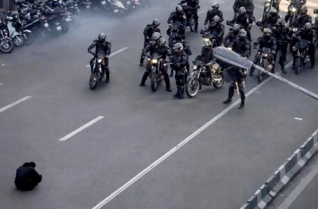먼저 오토바이를 탄 이란 무장경찰 앞을 외로이 막아선 한 시위대의 모습이 있다. 이 사진은 1989년 6월 중국 베이징 천안문광장에서 홀로 탱크에 맞서던 ‘탱크맨’을 연상시켜 화제가 되고 있다.
