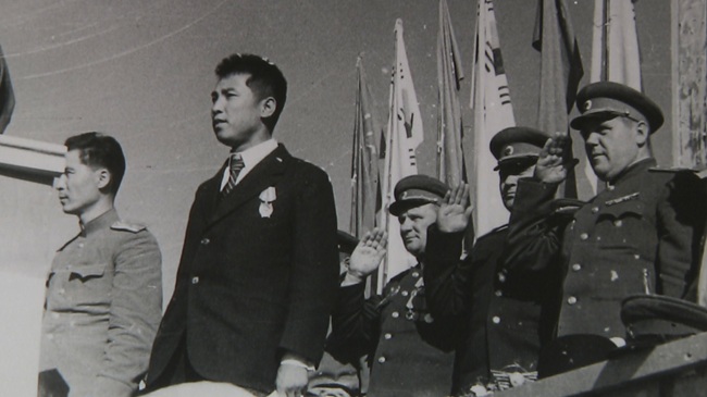 1945년 가을 ‘붉은 군대 환영 평양시민대회’에 소련군을 대동하고 나타난 김일성.