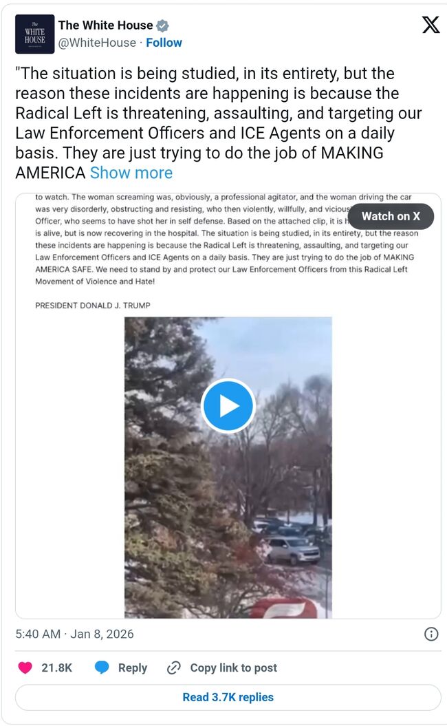 그러면서 "(ICE) 요원은 정당방위로 그녀에게 총을 쏜 것으로 보인다"며 "첨부된 영상을 보면 그가 살아남았다는 사실이 믿기 어려울 정도지만, 현재 병원에서 회복 중이다."라고 밝혔다. 또한 사건은 아직 조사 중이라고 덧붙였다.