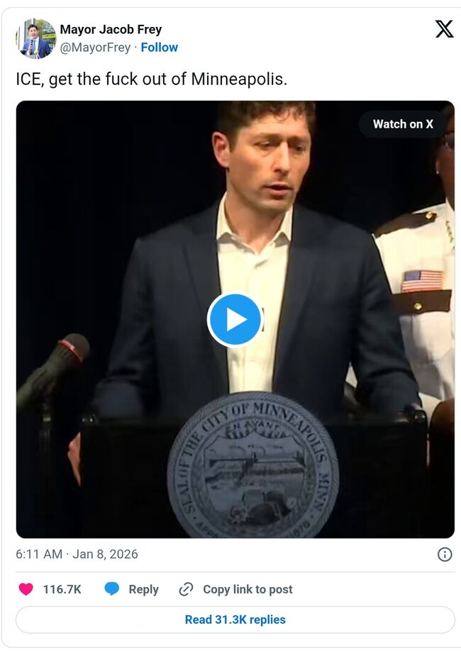 시장은 욕설이 섞인 발언을 하며 ICE에 "미니애폴리스에서 즉각 떠나라"고 촉구했다. 그는 나아가 시민들이 "희망과 사랑, 그리고 평화와 정의구현을 위해 연합하자"고 선동하고 나섰다.
