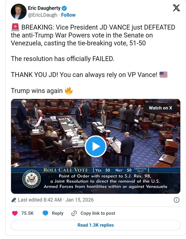 트럼프 대통령은 지난주 민주당과 함께 결의안 추진에 동참했던 공화당 상원의원 5명에게 강력한 압박을 가했으며, 결국 법안 통과를 저지하는 데 성공했다. 공화당 의원 중 조시 할리(Josh Hawley,미주리) 의원과 토드 영(Todd Young,인디애나) 의원 등 2명이 입장을 바꿨다.