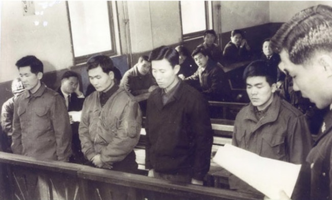 1968년 11월 군사법정에서 열린 통일혁명당 사건 관련 피고인들. 왼쪽부터 신영복, 이영윤, 송준철, 신남휴. 이날 군 검찰은 신영복에게 사형을, 나머지 세 명에게는 징역 7~10년을 구형했다.