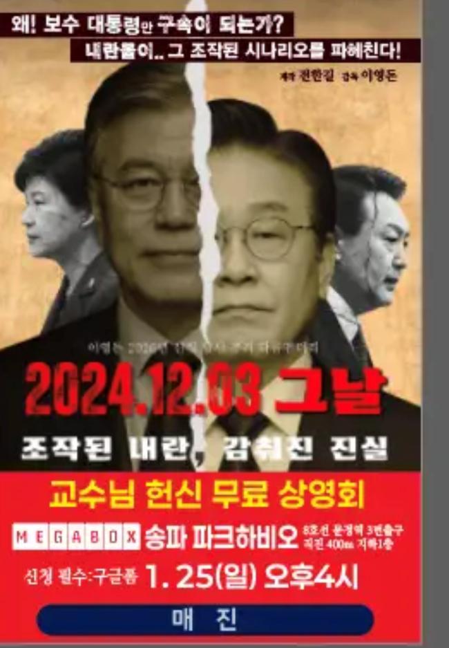 어제 전 김수정 교수님의 배려로 전한길 선생이 제작한 영화 ‘2024.12.03 그날’ 시사회에 참석하였습니다.